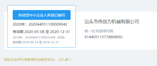 我司汕頭市偉創(chuàng)力機(jī)械有限公司被評(píng)為2020年全國(guó)"科技型中小企業(yè)"